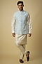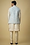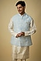 Featuring a powder blue bundi jacket in silk and tissue silk base. It is paired with a kurta, pants and a pocket square. Style it with loafers for a wedding, engagement or festive gatherings.