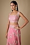 Featuring a pink ruffled saree in organza and chiffon base with aari hand and machine embroidery. It is paired with a blouse. Accentuate with pearl jewellery and block heels for sangeet, engagement ceremonies or weddings.