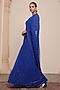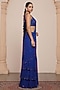 Featuring an electric blue tiered ruffled saree in georgette base. It is paired with a blouse. Style this saree with diamond jewellery, block heels and a sleek bun, an ideal choice for your wedding day, sangeet or haldi ceremony.