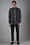 Featuring a space blue bandhgala in raw silk base with hand french knot embroidery. It is paired with blended wool pants. This attire would be an excellent fit for festive occasions or sangeet ceremonies.