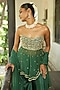 Featuring a deep green kurta in uppada silk and georgette base with pitta work, cutdana, pearl and glass beads embroidery. It is paired with sharara pants and an embroidered dupatta. Accentuate it with dangler jewellery and heels for a festive occasion, mehendi, wedding or engagement ceremony.