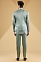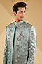 Featuring a chateau grey indowestern in linen silk base with zardosi hand embroidery. It is paired with a short kurta and pants. Perfect wear for a wedding or sangeet ceremony, exuding traditional charm and elegance.