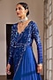 Featuring an inky blue anarkali in georgette and net base with an attached draped dupatta, moti and sequins embroidery. It is paired with a belt. Accentuate it with diamond jewellery and metallic heels for a cocktail party, reception or evening gala.