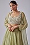 Featuring a mint green lehenga in organza base. It is paired with a matching net embroidered blouse and a jacket.