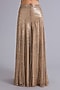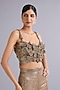 Featuring a gold crop top in tulle base with slim straps, ruffle detailing and sequins embellishments. It is paired with wide-leg trousers. Pair with statement danglers and stilettos for a glamorous appeal, Perfect for cocktail nights, receptions, or evening galas.