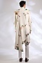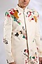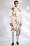 Featuring an ivory indowestern in matka silk base with laser cut applique embroidery. It is paired with pants. Perfect wear for a wedding, sangeet or engagement ceremony, exuding charm and elegance.