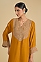 Featuring a yellow kalidar choga kurta in pure upada silk base with pearls and kirandori embroidery, including a zero neckline. It is paired with salwar pants. Accentuate it with dangler earrings and heels for a festive occasion or pooja ceremony.